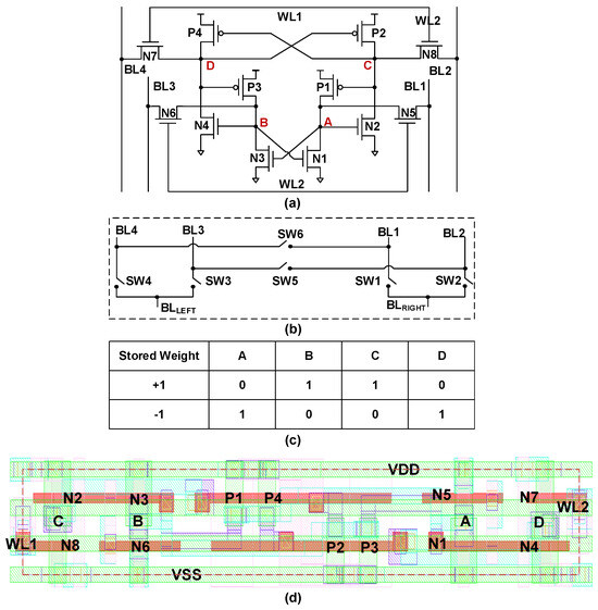 (a) The proposed TA-Quatro configuration, (b) bitline switching schematic, (c) the relation between the stored weight value, and the equivalent memory node status in the TA-Quatro cell, (d) thin-cell-type layout of TA-Quatro cell in the 28 nm FD-SOI technology.