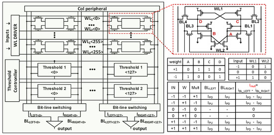 Figure 4 illustrates our ADC-less TA-Quatro architecture for a ternary activation IMC, where the TA-Quatro array directly computes the MAC operations in an analog fashion. The table in Figure 4 summarizes how our TA-Quatro cell executes the analog multiplication between the weight and activation. The input neuron value of ‘−1’, ‘0’, or ‘+1’ corresponds to the logic level of the two split wordlines (WL1 and WL2) as (0, 1), (0, 0), or (1, 0), respectively. Meanwhile, the binary weight value ‘−1’ is represented by the state of four nodes—A, B, C, and D—as A = D = VDD, B = C = GND, or vice versa for the corresponding ‘+1’. Then, the multiplication result is expressed by ‘’ as the difference of two bitline currents (i.e., = ). For instance, when the input neuron value is ‘+1’ (A = D = GND and B = C = VDD), and the weight value is ‘+1’ (i.e., WL1 and WL2 are (1, 0), respectively), BLLEFT is pulled down, and BLRIGHT is pulled up. Therefore, the multiplication result is represented by = − . When the input is 0, it means that WL1 and WL2 are inactivated, so there is no current through the bitlines, thus representing a multiplication result of 0. Other cases of input and weight values are expressed in the table of Figure 4. In the array level, when all the WLs are activated at the same time, the ‘’ and ‘’ of each cell on the column are accumulated through the column-shared BLLEFT and BLRIGHT, respectively. Under this circumstance, the MAC output is represented by the difference of the accumulated currents, which is described as ‘’ and ‘’ in Figure 4. Such a differential-end IMC operation delivers ADC-less ternary activation outputs, as further discussed.