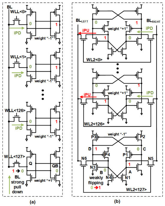 (a) The schematic of XNOR-SRAM cell [2] and (b) TAIM cell [1].