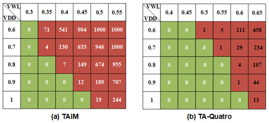 The number of the flipped cells depends on the supply voltage and wordlines voltage with 1000 MC simulation on TAIM (a) and our TA-Quatro (b).