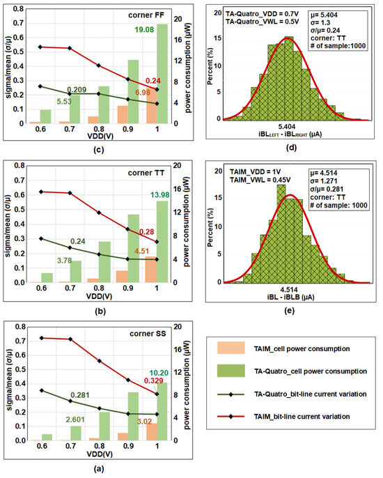 (a–c) variability of bitline currents and power consumption of considered TA-Quatro and TAIM versus different supply voltages in SS, TT, and FF corners, respectively. (d,e) the normal distribution of ‘’ − ‘’ in TA-Quatro and TAIM.