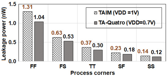 As was aforementioned, our target is to develop an IMC technique for the AOB, which continuously turns on even in standby mode. Therefore, leakage power consumption significantly affects the power efficiency of the IMC circuit. Please note that lowering the power supply (VDD) in TAIM requires reducing the VWL (wordlines voltage) to minimize cell-to-cell interference, as we mentioned in Section 4.1. However, reducing the VWL affects the DNN accuracy, as process variations significantly impact the analog MAC outputs due to the low gate voltage of the access transistors, as discussed in Section 4.2. Consequently, we analyzed the power leakage consumption in comparison with TA-Quatro at two optimal VDD levels for IMC operation: 1 V for TAIM and 0.7 V for TA-Quatro. We investigated the leakage power consumption of TAIM and the proposed TA-Quatro at various process corners. Figure 9 shows that our TA-Quatro at VDD = 0.7 V had better leakage power consumption than TAIM at VDD = 1 V (18.9% better than TAIM in the TT process corner). The leakage current in transistors is exponentially dependent on the threshold voltage () [14]. A higher reduces the leakage current in transistors when they are in the off state. Since transistors in the slow–slow (SS) corner have higher Vt values compared to other corners, such as typical (TT) or fast (FF) corners, the SS corner yields the lowest leakage power. Even in the SS corner, the TA-Quatro at VDD = 0.7 V demonstrated better leakage power consumption than TAIM at VDD = 1 V, thus showing a 14.3% improvement over TAIM in the SS process corner. TA-Quatro exhibited lower leakage power consumption compared to TAIM, despite featuring a higher number of transistors, thanks to its adept operation at lower voltage supply.