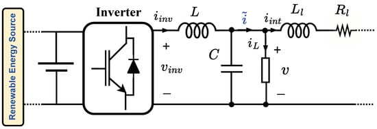 where L and C are the inductance and capacitance of the LC filter. In this formulation, the load and interconnection line currents are both considered external disturbances and grouped together as the disturbance current .