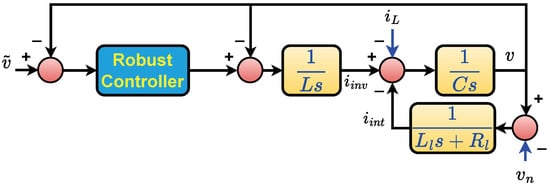 In [14], a robust controller was designed for each inverter system independently by considering the coupling dynamics of interconnection lines as external disturbances. The closed-loop block diagram of each inverter system is demonstrated in Figure 2. The voltage source inverter robust controller is designed by using a -synthesis framework by considering LC filter parameter uncertainties in the design process. The LC filter parameter variations are in the range of of their nominal values [9]. Moreover, the load and interconnection currents are lumped together and considered one external disturbance. The resulting voltage source inverter robust controller is of order 14 [14] and is presented later in Equation (2) in this paper. The details of the robust controller design procedure can be found in [14,27,28].