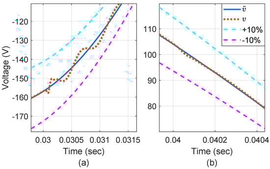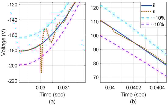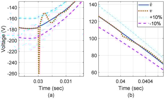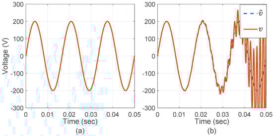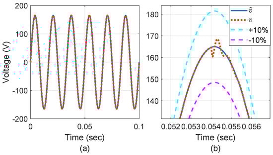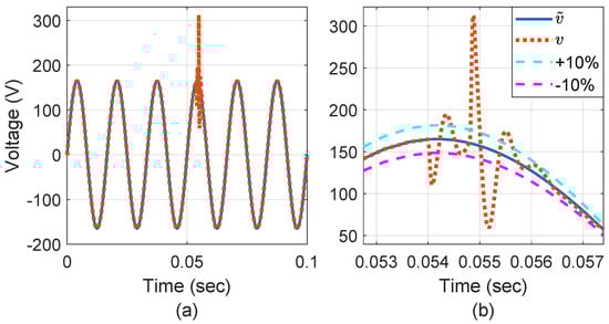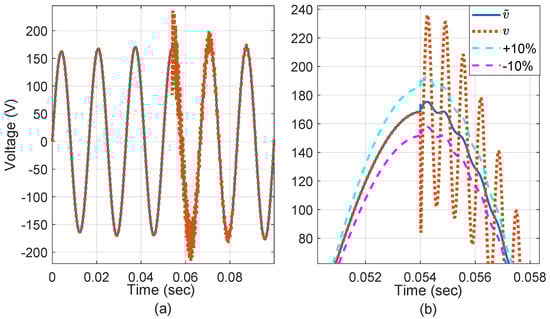 In this case study, the effect of the peak-load demand on the performance of the system is investigated. The load demand of the SSMG can vary depending on the number of appliances used by the customers. The purpose here is to demonstrate that the proposed retrofit MPC scheme can damp the undesired oscillation resulting from the peak-load demand. According to [34], in the worst-case scenario, the active and reactive powers of a residential load are calculated to be around 21 (kW) and 10 (kVAR), respectively. This load is added to the SSMG at 0.054 (sec). The proposed retrofit MPC structure is capable of stabilizing the inverter system as per the capacitor voltage graph of inverter 3 () in Figure 7 demonstrated in Figure 9. It can be observed in Figure 9b that when the load is introduced to the SSMG, the output voltage has a very small deviation from the reference voltage and is within of the nominal level. On the other hand, when its peers are used, the performance of the closed-loop system deteriorates significantly, as shown in Figure 10 and Figure 11. It is clear from Figure 10b and Figure 11b that the capacitor voltages go beyond the margins from the nominal voltage level.