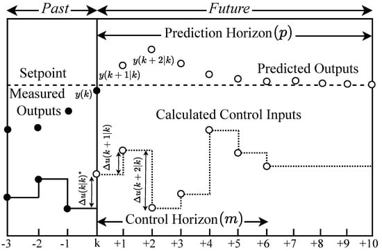 The MPC law is shown in Figure 5. At present time k, system output is measured. In order to calculate control input , control horizon of length m is considered. Based on this control horizon, the objective is to calculate the sequence of control increments , , …, , in which the notation denotes the calculated value of the control increment at time in the future given measurement at present time k. The sequence of control increments is calculated by solving a constrained optimization problem including a cost function in terms of the sequence of control increments and a sequence of predicted system outputs over prediction horizon of length p. The latter includes , in which the notation denotes the predicted value of the system output at time in the future given measurement at present time k.