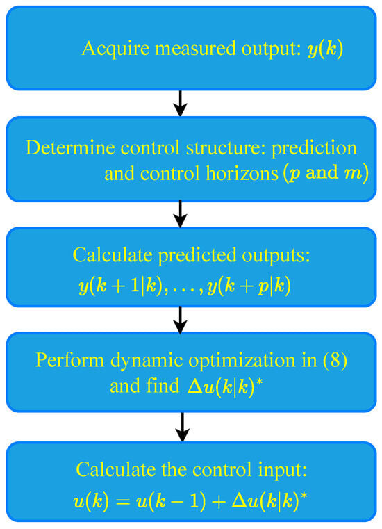 At each sampling interval k, (8) is solved by using a quadratic programming (QP) solver with respect to the sequence of input increments and the slack variable . However, according to the receding horizon concept, only the first element of the optimal sequence, , is selected to update the control input as . In the case where the QP problem becomes infeasible due to numerical reasons, the second sample from the previous optimal input sequence is employed, as in . The flowchart of the MPC design process explained above is illustrated in Figure 6 and is summarized as follows:
