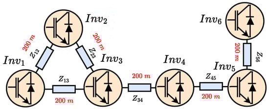 An SSMG consisting of six inverter-based DERs was considered for the simulation studies, as shown in Figure 7. Table 2 lists the parameter values of all of the inverter systems. These systems are connected to each other via interconnection lines illustrated by impedances that include both inductive and resistive properties.