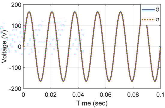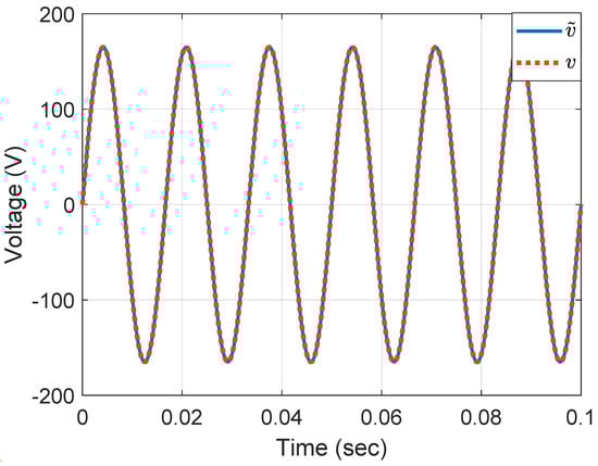 In this case study, the distance between every two inverter systems in Figure 7 is considered to be 200 (m). The remaining parameters, including LC filter parameters and load, are chosen to be their nominal values in Table 2. Moreover, all loads are assumed to be linear. Figure 8 demonstrates the capacitor voltage of inverter 3 () in Figure 7 with the proposed retrofit MPC technique. The reference voltage amplitude for this inverter is considered to be 165 (V). As is observed, the capacitor voltage tracks the reference voltage. The proposed retrofit MPC structure in Figure 4 stabilizes the unstable system shown in Figure 3b. The performance of the VI control and retrofit LQR (benchmarks) methods is the same as the proposed MPC method for the case of the nominal load in Table 2. However, the amplitude of the reference voltage in the VI control scheme drops to 163 (V), which is still within of the nominal amplitude, 165 (V). Therefore, the retrofit MPC and LQR schemes and the VI control technique are able to stabilize the SSMG with the nominal load when the distances among inverters are 200 (m). However, the superiority of the proposed retrofit MPC scheme over its peers will be demonstrated next.
