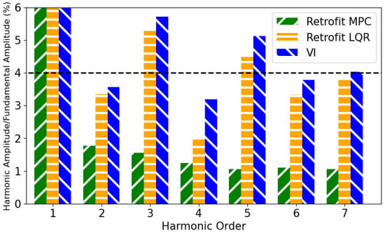 Nonlinear loads have become integral components of modern power systems due to the significant growth of power electronic equipment such as uninterrupted power supply and rectifiers. Nevertheless, such loads introduce harmonics into current and voltage waveforms, which, in turn, negatively impact the quality of the generated electrical power [35]. In this paper, a diode rectifier is employed to model a nonlinear load, which is a ubiquitous model in the study of power systems [36,37]. By applying this nonlinear load, the load current becomes distorted, which consequently impacts the voltage of a capacitor. Figure 15 illustrates the harmonic contents of the capacitor voltage for the distorted nonlinear load current. According to the IEEE 1547 standard [38], the maximum harmonic voltage distortion for harmonics less than 11 should be . As observed in Figure 15, the proposed retrofit MPC scheme maintains the harmonic voltage distortions below this limit, while its peers exceed the limit for the third and fifth harmonics.