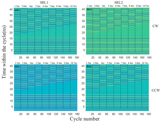 In order to validate the effectiveness and stability of the inhibition response, we present the time maps of SRL1 under continuous perturbations, as shown in Figure 3(a1,a2). In these maps, the color transition from blue to yellow indicates the gradual increase in signal intensity, with the horizontal axis representing the cycle number and the vertical axis representing the time within the cycle. From Figure 3(a1,a2), it is evident that both the CW and CCW outputs of SRL1 can produce stable inhibition behavior for 100 continuous perturbations (no single straight-line regions are observed), which demonstrates the repeatability of this inhibition behavior.