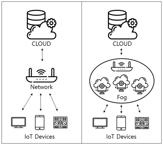 The fog server is physically closer to the device than the cloud server. A fog server can process primary data generated by the device at a faster rate and respond in real time, and it sends key secondary data that has already been processed once to the cloud for processing. Thus, it can drastically reduce the data load on the cloud [3]. Figure 1 is a comparison of cloud computing and fog computing.