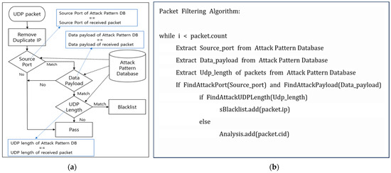 Based on this, this study implemented the mitigation model. Figure 2 shows the algorithms of the proposed mitigation model. It shows the algorithms for determining the blacklist, which compares the UDP length, source port, and payload by using a database that stores attack patterns. This mitigation algorithm has a simple structure rather than a complex filtering structure. It is designed to fit the above three requirements for fog computer environments.