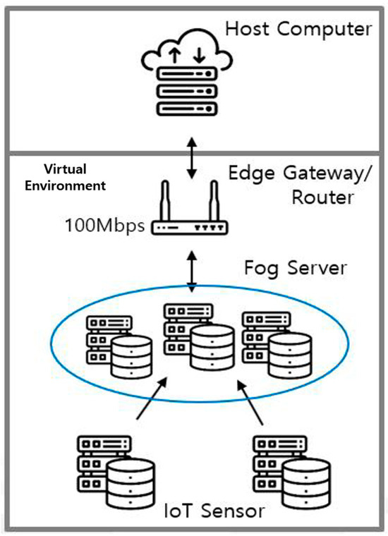 Vmware, a virtual environment, was used for the experiment, and the environment was configured as shown in Figure 3. It was configured to allow one virtual machine to act as a router to distribute incoming traffic to internal fog servers according to the Round Robin method. The Snort intrusion detection module, log server, and simple packet filtering were installed on the fog server, and a program to exchange random virtual weather data between IoT sensors and fog servers was also implemented. The host attacked the fog server by using the Kali Linux attack tool and the Memcached attack tool.