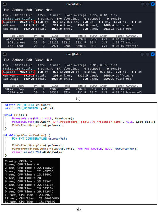 Figure 4 shows the screenshots during the simulation. Figure 4a is a screenshot of the initial Snort startup. Figure 4b shows a screenshot of the local.rules file of Snort. Figure 4c,d are screenshots measuring the CPU time. Figure 4c shows a screenshot of the CPU time measured using the top command every second. Figure 4d is an example of measuring the percentage value CPU time for all processes in user mode using the API of the Windows OS.