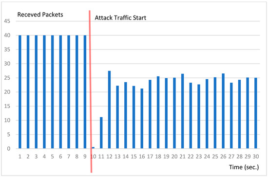 Figure 6 shows the number of normal packets received in 30 s. As shown in the figure, the DRDoS attack begins exactly after 10 s. It may be seen that successful transmission is not performed until the attack pattern is applied and blocking is performed. After that, after normal blocking is performed, the successful packet delivery rate is stable at around 80%.