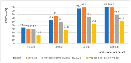 CPU time based on the number of attack packets. Comparison of Snort, Suricata, Method of Ismail Melih Tas 2023 [32], and our proposed method.