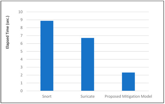 In Figure 7, CPU time in a low-specification fog computing environment, showed similar results for both Snort and Suricata. However, it can be seen that the proposed mitigation model shows a low CPU time, because we use modified Snort with many functions removed. Ref. [32] describes a defense mechanism to mitigate SIP-DRDoS attacks. This method is not aimed at operating at low specifications like in fog computing environments. However, since some security configurations operate in the kernel mode, we obtain a good performance in terms of CPU times, although this method [32] and our proposed method do not use the same environment.