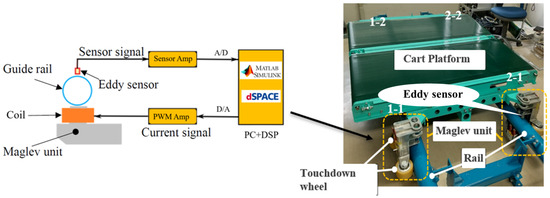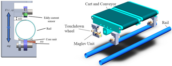 A Maglev cart has four Maglev units in its system. To better describe the Maglev cart system, Figure 1 illustrates the detailed part of four units. The Maglev cart’s mechanical design process and the the electromagnetic force analysis have been explored in the [3]. The parameters of the mechanical part and the electronics are kept in accordance with [3]. The coil wound around the PM unit was installed on the bottom of the bracket. The coil current is the control variable of Maglev system unit. The eddy-current displacement sensor was installed on the top of bracket. The sensor detects the displacement of the rail movement in the vertical direction. The Maglev unit and the eddy current sensor were installed on the bracket. Moreover, there are touchdown wheels assembled on the bracket, which restricts each Maglev unit to only be able to move in vertical directions by mm. The left part of Figure 1 also indicates the 3D view of the Maglev cart system.