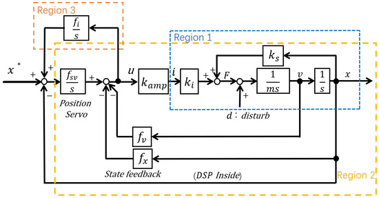 In this research, this method focuses on the analysis of the current amplifier and coil circuit operating in linear mode. The amplifier is presented in the system. For the coil unit, which requires strict and high-precision control, we introduce a position servo integrator to eliminate steady-state error in the balanced position. The position servo integrator is placed in combination with the feedback controller to eliminate steady-state errors [21]. The original Maglev system is a typical second order system. Hence, the system’s order is increased to three. Three-order poles, based on the pole placement theory, are placed in the left half plane (LHP). There are three feedback gain parameters: one for the displacement of the system output, denoted as ; one for velocity, denoted as , which is difficult to measure directly (here, we derive it by using an approximate derivative of position as a replacement for velocity detection); the final parameter is denoted as . This part is shown in Figure 2, Region 2.