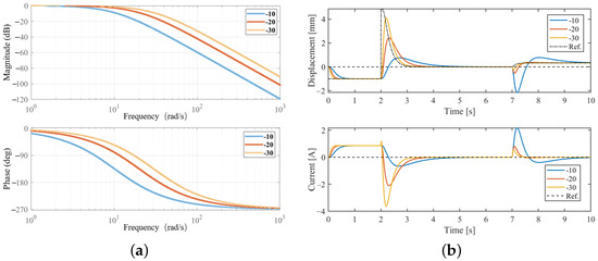 Simulation results of Maglev unit with zero-power controller in MATLAB with different poles. (a) Magnitude and phase of unique Maglev unit’s simulation; (b) Displacement and current of unique Maglev unit’s simulation.