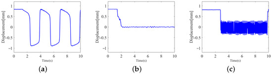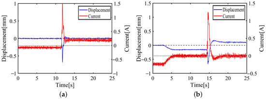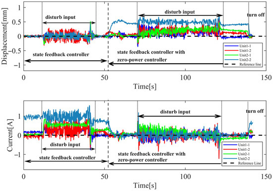 Figure 6a illustrates the outcome of the displacement and current of the Maglev unit, which is regulated by the state feedback controller without the zero-power controller. Upon activating the state controller, the system exhibits consistent positioning at 0 mm, accompanied by a current of around −0.2 A, hence guaranteeing the stability of the system at the 0 mm position. Approximately 12 s later, an 8 kgf perturbation is introduced, and it is found that the system rapidly returns to the 0 mm position. Furthermore, the system’s current undergoes variations, resulting in a consistent output of +0.2 A.
