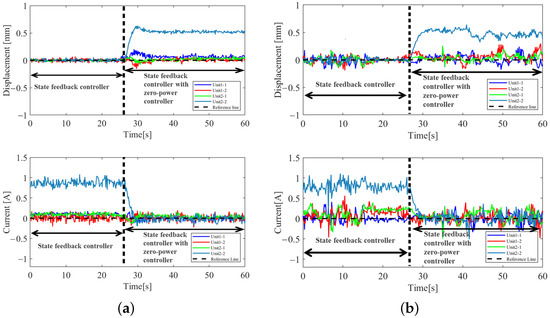Experimental result of displacement and current of Maglev unit controlled by state feedback controller combined with and without zero-power control. The dot line in the Figure indicated the reference line for 0 mm and 0 A. (a) States feedback controller; (b) Zero-power controller.