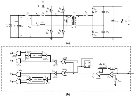 Main circuit and control circuit block diagram of the proposed active clamped dual-inductor isolated CS/CS converter. (a) Main circuit topology; (b) Control circuit.