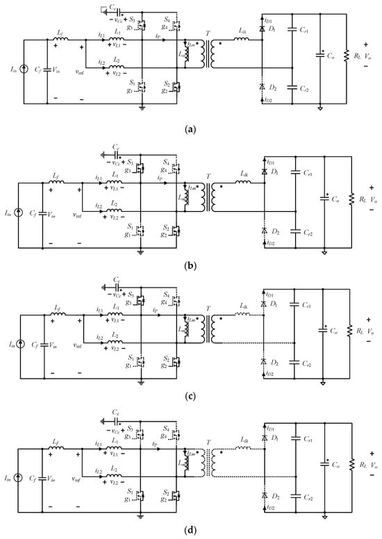 As shown in Figure 2a, the proposed circuit consists of the input filter capacitor Cf, input filter inductor Lf, power inductors L1 and L2, clamp capacitor Cc, power switches S1, S2, S3, and S4, transformer T, secondary rectifier diodes D1 and D2, resonant capacitors Cr1 and Cr2, resonant inductor Llk, which is the secondary leakage inductance of the transformer T, and the output filter capacitor Co. The active clamp circuit is employed on the primary side of the converter to suppress voltage spikes and return the energy stored in the leakage inductance of the transformer. The secondary output voltage doubling circuits can expand the output voltage range; as the capacitors of the voltage doubling circuit are resonant with the leakage inductance of the transformer T to improve efficiency, the proposed converter can achieve a wide output voltage range.
