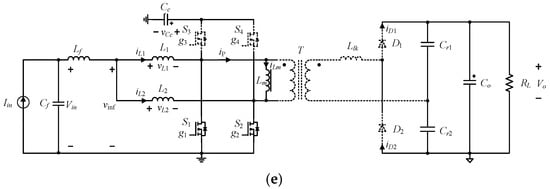 Mode E (t4 − t5): As depicted in Figure 3e, switches S1 and S2 are turned on, while switches S3 and S4 are turned off. As both main switches S1 and S2 are turned on, the input voltage is applied to the inductors L1 and L2, the currents iL1 and iL2 increase linearly, and the voltage across the primary winding of the transformer is almost zero. Then, iL1 and iL2 can be given as