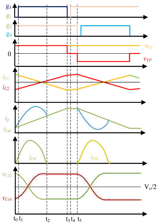 For the convenience of theoretical analysis, it is assumed that all switches, diodes, inductors, and capacitors in the topology are ideal components. There are ten operating modes within one switching cycle of the proposed converter. Since the proposed converter can operate symmetrically, only the five operation modes during the first half of the switching cycle are analyzed. Figure 3 and Figure 4 illustrate the operation modes and key waveforms of the proposed topology.