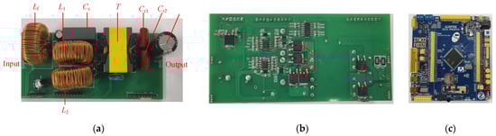 Experimental prototype. (a) Top side of main circuit board; (b) Bottom side of main circuit board; (c) Control circuit.