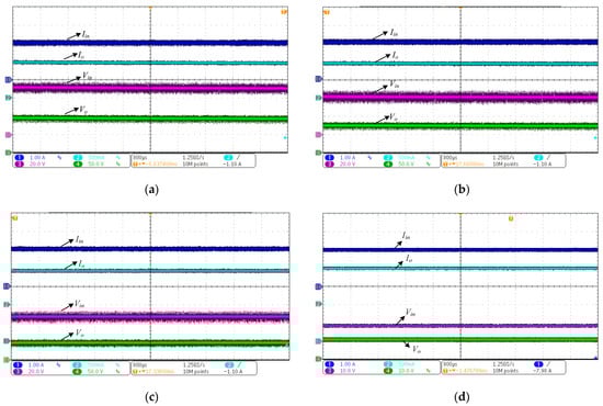 Test waveforms of input current Iin, input voltage Vin, output current Io, and output voltage Vo with different output loads. (a) 100% load; (b) 80% load; (c) 50% load; (d) 10% load.
