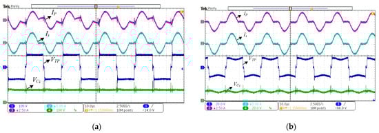 Figure 8 illustrates test waveforms of the primary voltage vTP of the transformer, primary current iP of the transformer, secondary current iS of the transformer, and clamp capacitor voltage vCc with 100% load and 10% load. From the test waveforms, it can be seen that the clamp capacitor voltages vCc with 100% load and 10% load are around 110 V and 14 V, respectively, which is the same as the calculation analysis of Equation (24).