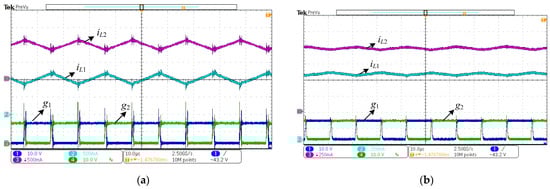 Figure 9 shows the experimental waveforms of inductor currents iL1 and iL2 and driver signals of S1 and S2 with 100% load and 10% load. It can be seen that the average current value of iL1 and iL2 is around 1 A, and the inductor current ripples ΔiL1 and ΔiL2 are same because of the same inductor L1 and L2 values. The inductor current ripples ΔiL1 and ΔiL2 with 100% load and 10% load are around 300 mA and 40 mA, respectively, which is the same as in the theoretical analysis of Equation (34). From the test waveforms of Figure 7, Figure 8 and Figure 9, the operation waveforms are the same as the theoretical analysis waveforms in Figure 4.