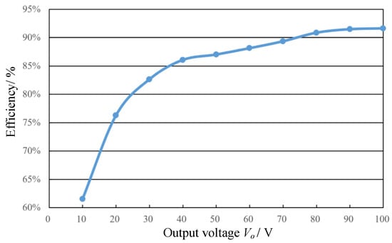 Figure 10 shows the experimental results of the efficiency with different output voltage loads. It can be seen that the conversion efficiency reaches 91.6% with a rated 100 V output voltage load, and the efficiency decreases to 61.5% with a 10 V output voltage load. Compared to the CS/CS converter of references [5,16], the CS/CS converters of [5,16] have no output current regulation control circuit, and thus the constant output current regulation accuracy of the proposed circuit of this paper is better than the circuit in references [5,16]. The deviation of the output current of [5,16] is greater than 8% and 4% when the output voltage changes from 100 V to 10 V, but the output current can be regulated well within the whole output voltage range. The efficiency of the circuit of reference [5] changes from 81% to 52% with the output load voltage variation from 100 V to 20 V; the efficiency of the proposed circuit of this paper changes from 91.6% to 61.5% with the output load voltage variation from 100 V to 10 V. Therefore, compared to the circuits in references [5,16], the output current regulation accuracy and conversion efficiency of the proposed circuit is improved.
