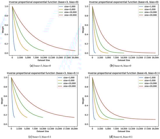 where is the decay rate of the function, which affects the shape of the curve. The function curve tends to become concave as increases; conversely, as decreases, the curve becomes increasingly smooth. represents the total number of samples in the entire dataset. We can dynamically adjust the weights for imbalanced data scenarios via the IPEF, thereby effectively improving the classification performance of the model on imbalanced data. Figure 3 shows that the function maintains its basic shape across various data scales for different parameters, demonstrating good generalizability.