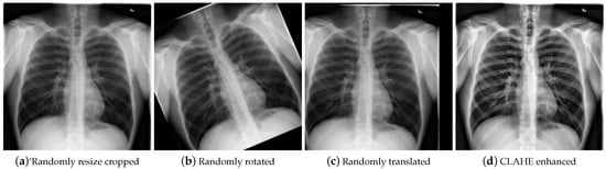 - CLAHE image enhancement: Contrast-limited adaptive histogram equalization (CLAHE) is used to improve image contrast, which is particularly suitable for CXR images, significantly enhancing image quality and better supporting model training (see Figure 5d). This method has been widely validated as effective in medical imaging [].