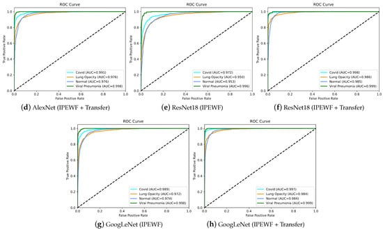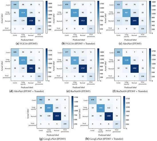 We continued to analyze the confusion matrices for the four models. By comparing Figure 8a,b, we find that the performance of the VGG16 (IPEWF+transfer) model, which combines the IPEWF method and TL techniques, improved significantly. Specifically, the number of correct classifications in the small sample class of pneumonia patients increased from 238 to 271. For the COVID-19 class, the number of correct classifications also increased significantly, from 590 to 670. Additionally, the correct classification numbers for the other two classes also showed substantial improvement. A comparison of Figure 8c,d reveals that the AlexNet (IPEWF + Transfer) model, which applies the IPEWF method combined with the TL technique, also has positive effects. The classification accuracy of the model improved significantly for both small and large sample classes. Comparing Figure 8e,f, the ResNet18 (IPEWF + Transfer) model, which incorporates TL techniques based on the IPEWF method, showed improved performance in most classes, although the correct classification number for the pneumonia class slightly decreased. However, it demonstrated better performance in other classes. A comparison of Figure 8g,h reveals that the GoogLeNet (IPEWF + Transfer) model, which combines the IPEWF method and TL techniques, yields some differences in the confusion matrix. Although the correct classification number for the lung opacity class decreased slightly from 1087 to 1085, this minor performance loss is acceptable considering the overall performance improvement. More importantly, the correct classifications for the pneumonia class increased from 234 to 267, those for the COVID-19 class increased from 662 to 667, and those for the normal class increased from 1810 to 1888. In summary, by combining the IPEWF method and TL techniques, the classification performance of all four models significantly improved, especially in terms of accuracy for critical classes. This further validates the effectiveness of this approach in enhancing the overall performance of the models.