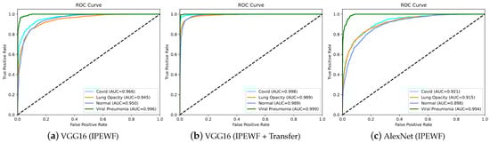 To further validate the effectiveness of our method, we specifically focused on the recognition ability of models improved by the IEWLF method and those improved by the TL method. By comparing the ROC curves of the various models under the combined methods, we can assess the classification performance of the models more intuitively. After the TL technique was applied, the AUC values for the COVID-19, lung opacity, normal, and pneumonia classes improved significantly. Figure 9 displays the ROC curves of the four models based on different strategies. The AUC results in Table 4 show that by combining the IEWLF method and TL techniques, we significantly improved the classification performance of the four models, especially in terms of the recognition ability for critical classes. These results further validate the effectiveness and potential of the proposed method.