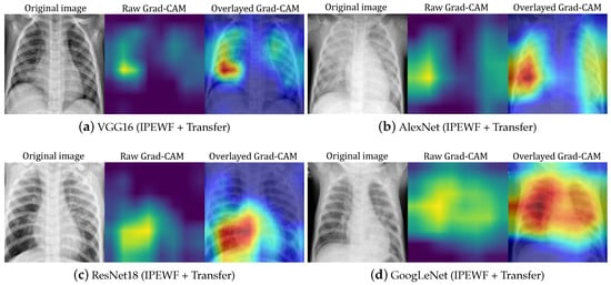 Finally, we selected the best-performing model in the experiment for interpretability analysis. Figure 10a shows the Grad-CAM activation heatmaps for the VGG16 (IPEWF + Transfer) model. These heatmaps highlight the key areas in the original image, providing intuitive aid for understanding the decision-making process of the model. The left side of each subfigure shows the original X-ray image of the detection target, the middle side shows the Grad-CAM activation heatmap, revealing the specific image regions the model relies on during prediction, and the right side presents the composite image overlaying these key regions on the original image, emphasizing the areas the model considers highly relevant to the predicted class. Similarly, Figure 10b–d display the Grad-CAM activation heatmaps for the AlexNet (IPEWF + Transfer), ResNet18 (IPEWF + Transfer), and GoogLeNet (IPEWF + Transfer) models, respectively. By analyzing these heatmaps, we can see that the models effectively recognize lesion areas, demonstrating the correspondence between the features learned by the models and the key diagnostic regions in actual medical images. This interpretability analysis provides a strong visual basis for evaluating algorithm performance and offers a valuable tool for assisting doctors in diagnosis. By observing these heatmaps, doctors can better understand the basis of the model predictions, thereby increasing their trust in the diagnostic results of the model. This approach, which combines advanced algorithms and visualization techniques, has the potential to play a significant role in practical clinical applications. These visualization results enhance our understanding of the decision-making process and further validate the practicality and effectiveness of the proposed method in medical imaging diagnosis.