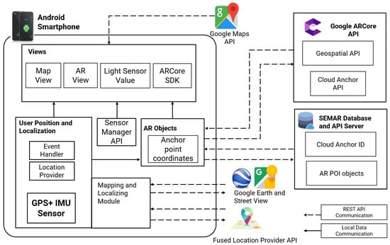 The application starts by retrieving predefined true POI coordinates from the SEMAR server, which functions as a back-end server. The SEMAR server offers a big data environment with capabilities for data aggregation, synchronization, classification, and visualization, which is accessible via a REST API in JavaScript Object Notation (JSON) format []. The prototype then obtains raw user location data through GPS and IMU sensors, enhanced by the Fused Location Provider API and processed by the Location Provider Module. The VSLAM technology refines user localization, especially for vertical positioning, while Google Earth and GSV provide geospatial and visual references. The ARCore SDK generates AR objects in real-world coordinates, managed by an event handler for user interaction with the AR and map views. Throughout this process, ambient light sensors continuously capture illuminance levels. The generated AR data, including anchor IDs, estimated POI coordinates, and illuminance levels, are stored on the SEMAR server for further processing. Figure 1 illustrates the detailed system architecture of the LAR system.