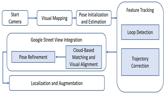 Based on the user’s location data, the system generates AR anchor objects. The LAR application accesses sensor data, communicates with the AR engine, and determines the placement of AR objects within the user’s field of view to create immersive, contextually relevant experiences. Figure 2 illustrates the general workflow of how VSLAM operates in conjunction with GSV. The detailed methods and development processes of the proposed prototype are described in previous research [].