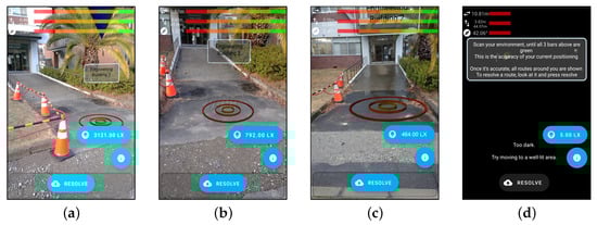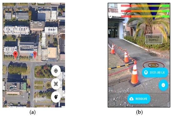 Equation (1) means that 1 lux is equal to 1 lumen per square meter (1 lx = 1 lm/m2). In order to measure illuminance values, we develop a light sensor module in our LAR prototype. The Android Sensor Manager class was utilized in this module. The measurement capability range of the embedded Android smartphone light sensor on average is from 0 to 100,000 []. The ambient light levels were then categorized into four categories: daylight, day overcast, rainy, and low light. The illumination values were recorded in each POI experiment and then the time taken for the system to track and align virtual content with real-world surroundings under different light conditions is also counted in the dataset. By selecting these independent variables, this study aims to provide a comprehensive analysis of the performance of VSLAM/GSV integration in outdoor LAR scenarios.