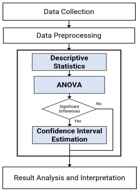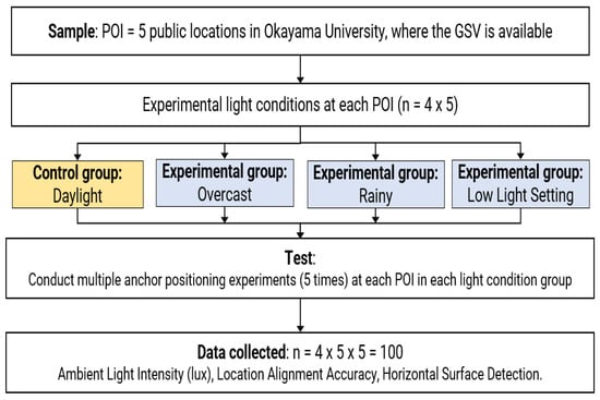 Descriptive statistics were used to analyze the data, providing insight into performance variations under different lighting scenarios. Four lighting conditions—daylight, overcast, rain, and low light—were considered as independent variables to evaluate system performance. The light intensities can vary in each seasonal condition and geographical location. Previous research in [,,] recorded the typical illuminance levels in all seasons as follows: daylight is in the range of –, overcast is –, rain is –, and low light is less than . The various light intensities in daylight conditions are used as the control group while the rest are used as experimental groups. The sample includes 100 datasets from five designated POIs within four different lighting conditions. In this study, measurement metrics with reliable significance levels of 95% and a level of significance of 0.05 () were adopted from the existing literature []. The experimental design flow is depicted in Figure 4.