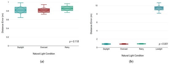 To verify our hypotheses, we split the sample data into four groups based on natural light conditions in daylight, day overcast, rainy, and low light, respectively. First, we compare the three groups and then we add the low-light group category in our dataset. Given a partition in the sample data, a one-way ANOVA test with a significance level () is applied to determine the significance difference from each group. The results of the two clustering scenarios as a box plot of the distance error for each group are summarized in Figure 7. The vertical axis corresponds to the mean of the distance error measurements. Different natural light conditions are clearly labeled and organized in separate groups.