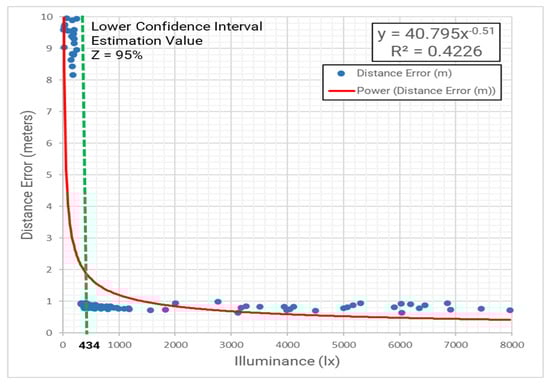 Notably, the green dashed line at 434 lx represents the lower confidence interval estimation value for a 95% confidence level. This threshold signifies the minimum illuminance required to achieve reliable performance, as errors below this value (left of the line) are significantly higher, often exceeding 9 m. Beyond this threshold, distance errors decrease significantly and stabilize below 1 m at higher illuminance levels, illustrating the critical impact of adequate lighting on the accuracy and reliability of the AR system. This emphasizes the necessity of maintaining at least 434 lx in practical applications to ensure optimal functionality.