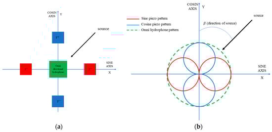 DIFAR sonobuoys, as illustrated in Figure 3a, integrate directional arrays featuring crossed pairs of piezoceramic transducers along with an omnidirectional reference transducer. The accelerometer functions as a bipolar pattern generator, while the hydrophone serves as an omnidirectional sensor. The pattern generated by these piezoelectrics, as depicted in Figure 3b, facilitates the process of acquiring directional information from surrounding sources.