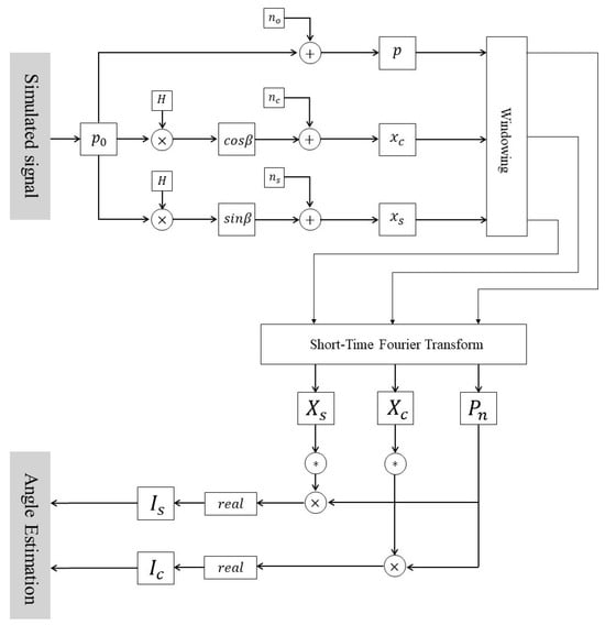 In Figure 3a, the blue rectangle along the y-axis forms the cosine dipole pattern, and the red rectangle along the x-axis creates the sine dipole pattern shown in Figure 3b. Expanding Equations (2) and (3) leads to Equations (4)–(6), which are the fundamental relationships for obtaining information in DIFAR sonobuoys. While improvements in system construction can reduce many error components, there remains an unavoidable bearing error induced by the ambient ocean noise present in the acoustic signals. In Equations (4)–(6), these noises are represented by no, nc, and ns for the omni-channel, cosine channel, and sine channel, respectively. Throughout the rest of this paper, subscripts o, c, and s will be used to denote the omni, cosine, and sine channels. In the DDP approach, employed in this paper for the DIFAR sonobuoy system, when the acoustic signal from the source impacts the sensor at a β angle relative to the y-axis, the output of each channel is obtained as follows [23]: