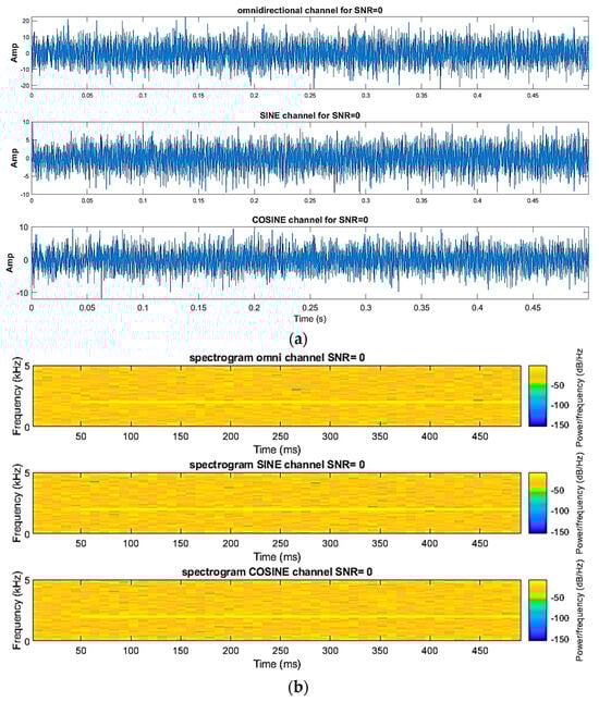 (a) Depicts a fixed-frequency cosine signal received by omnidirectional, sine, and cosine receivers. (b) Illustrates the short-time Fourier transform (STFT) spectrum of different channels for a single-frequency cosine signal at SNR = 0 dB.